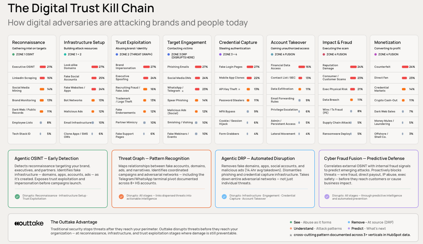 The Outtake platform runs autonomous agents continuously across social platforms, domains, app stores, ad networks, messaging apps, and the dark web, classifying threats as they form, not after they have already run. That continuous coverage is what made a dataset like this possible, and why a report like this has not existed until now.